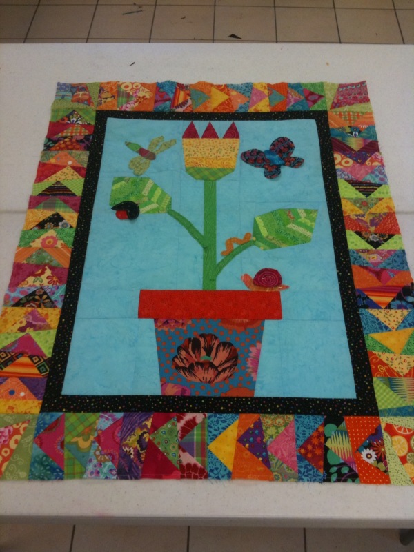 Karen Grabowski did this darling hoochy "Flower "power" quilt and isn't the color in the border dramatic? Karen is a quiet girl who doesn't say much and then you look at what she is doing and you are amazed! Mari Linfesty sent me this wonderful photo to share with you, They sat together at the Post Falls Mary Lou retreat.