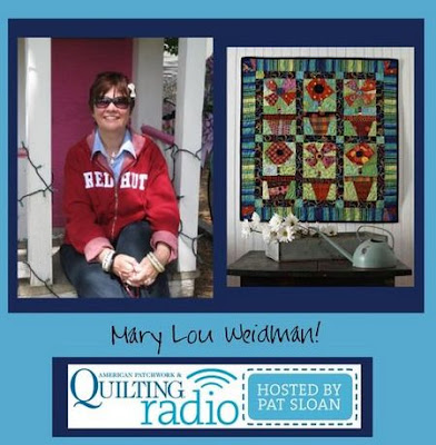 I have known about Pat for many years since I bought a charming basket pattern of hers in greens. She makes the kind of quilts that if I change my story quilt style, I would love to follow HER around and take her classes. They picked the right person for her job, talented, fun and NICE and she smiles. Don't you just love a quilter who smiles? I do! So, please listen to what we chat about. I might tell about an odd happening with my husband's Aunt who died this week. I was crazy about her...she was ahead of her time. Come listen! And check out Pat's blogs and website and facebook-she must be cloned!